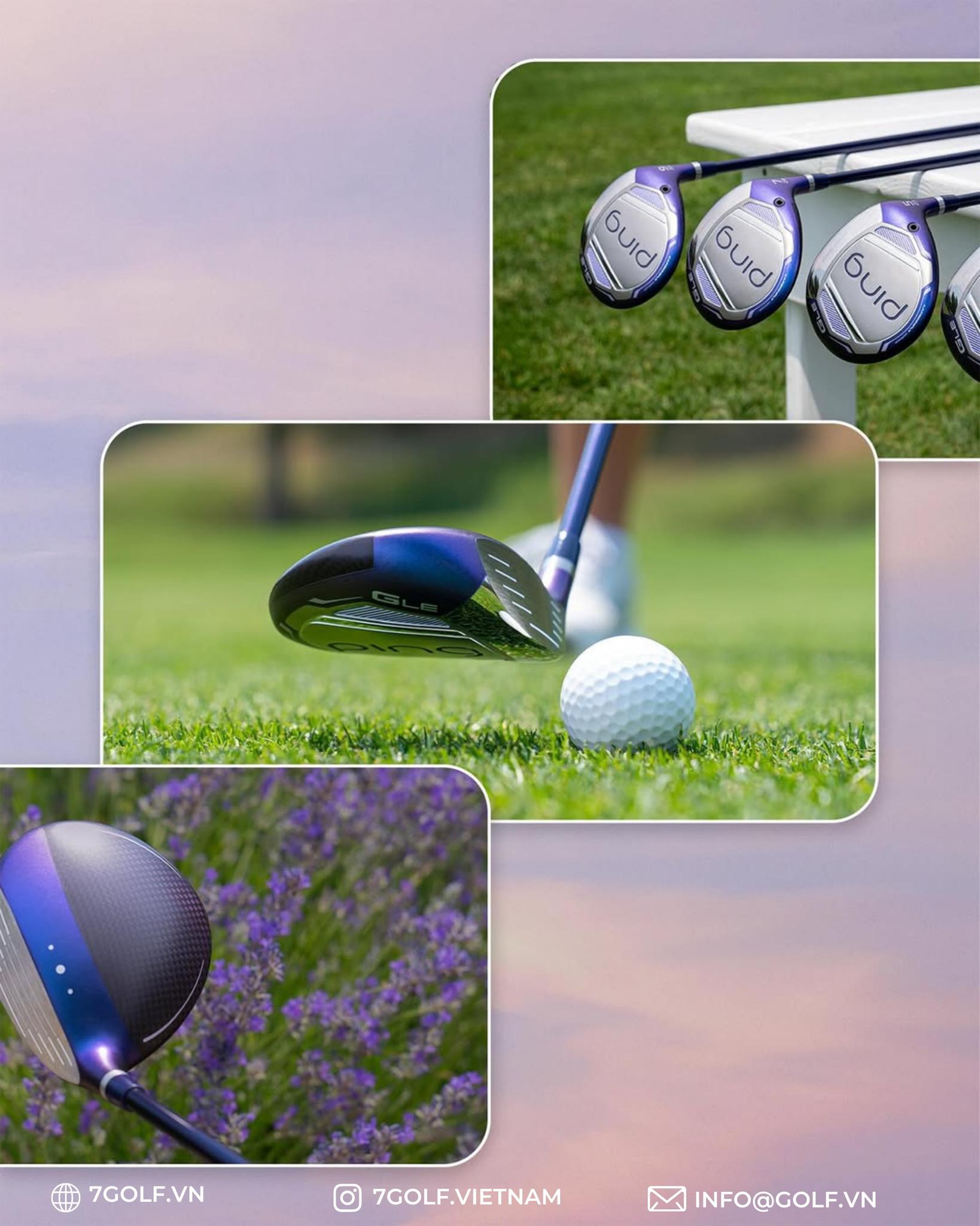 Điểm gây ấn tượng mạnh nhất của bộ gậy PING G Le4 nằm ở màu sắc và tổng thể ngoại hình. PING lựa chọn bảng màu “Galactic Lilac + Milky Way Midnight + gold accents”, tạo nên một phong cách mang hơi hướng vũ trụ, vừa nữ tính vừa mang tính công nghệ cao. Tông tím chủ đạo kết hợp với nền tối và các chi tiết vàng không chỉ giúp bộ gậy trở nên nổi bật trên sân mà còn mang lại cảm giác cao cấp, khác biệt hoàn toàn so với các dòng gậy nữ truyền thống.