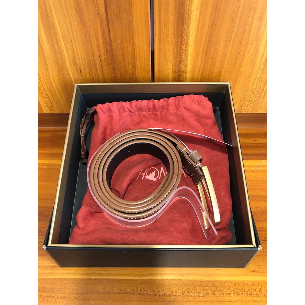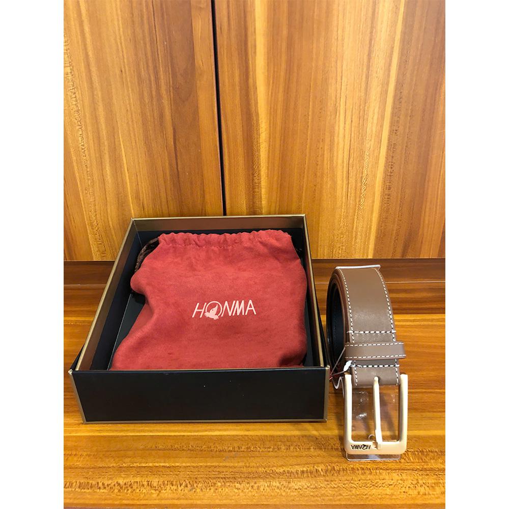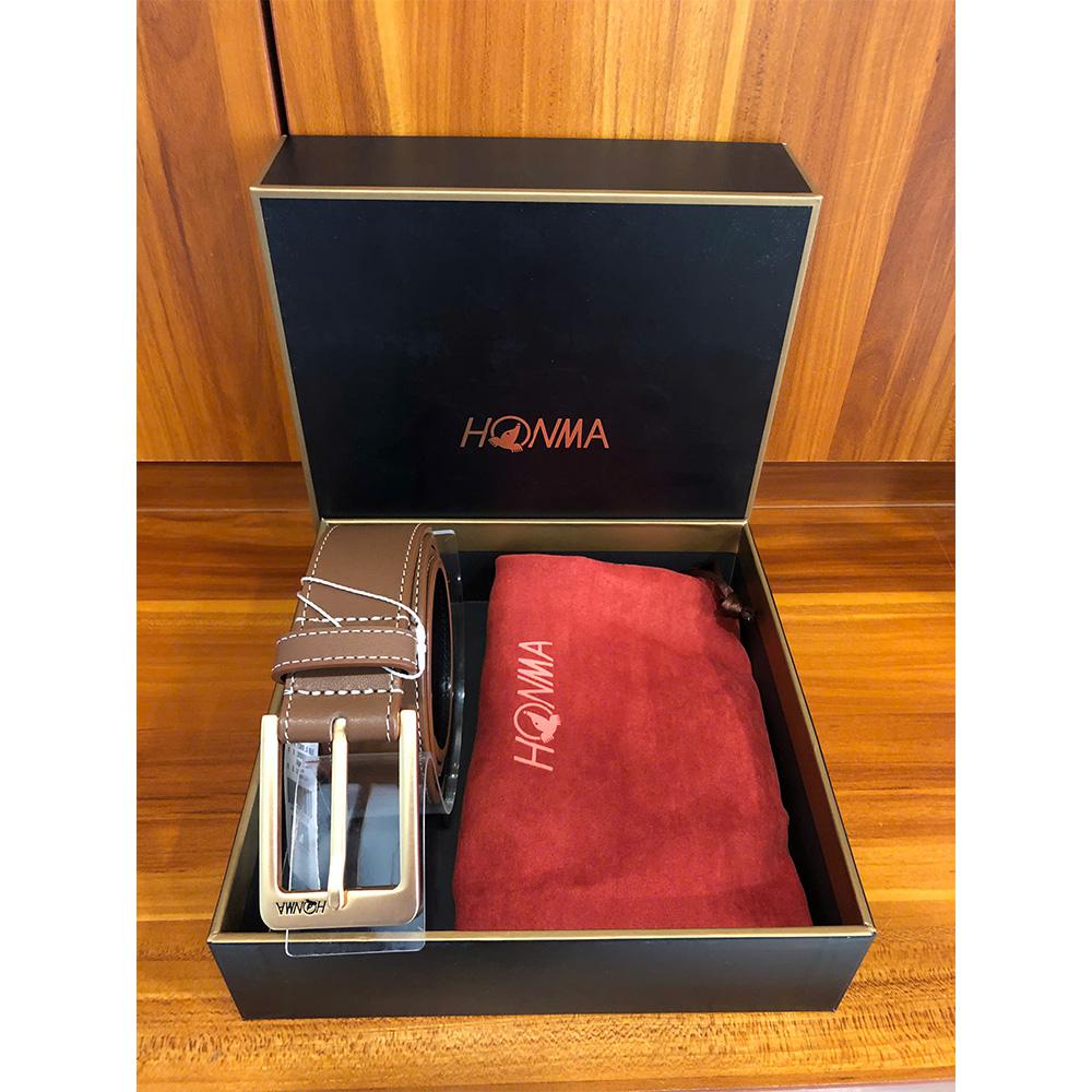 Thắt lưng da bò này được đựng trong túi dây rút có logo Honma và hộp quà tặng cũng có logo Honma.
